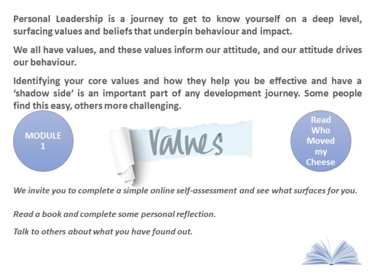 Personal Leadership is a journey to get to know yourself on a deep level, surfacing values and beliefs that underpin behaviour and impact. We all have values, and these values inform our attitude, and our attitude drives our behaviour. Identifying your core values and how they help you be effective and have a ‘shadow side’ is an important part of any development journey. Some people find this easy, others more challenging.