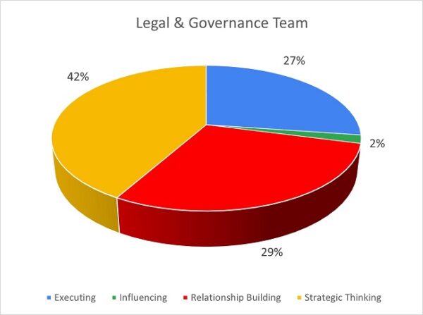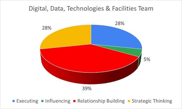 The profile is distributed between Executing, Influencing and Relationship Building, all of which focus on the people professional aspects of the organisation. A dominance in Relationship Building supports the work the team do in learning and support. An area for consideration would be to explore the gaps in the team with regards to Strategic Thinking and where an intentionality of new thinking with others could help to complement and further enhance the areas of greatest strength for themselves and for the employees they serve in the context of organisational vision, mission, and objectives.