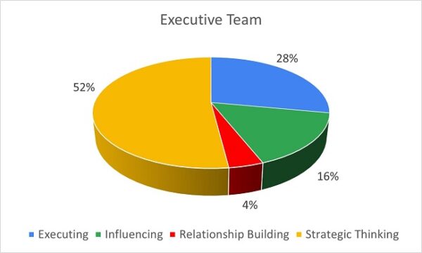 These signature strengths have significant responsibility and accountability for analysis, planning and strategic direction. Therefore, it is unsurprising that an Executive Team is heavily weighted to the Strategic Thinking domain. Because the team asks a lot of questions, others may see this team as doubting or questioning the validity of others work, which can be demoralising. Strong Strategic Thinking themes increase the seriousness and intensity of a team, which can result in lots of planning with not so much action.