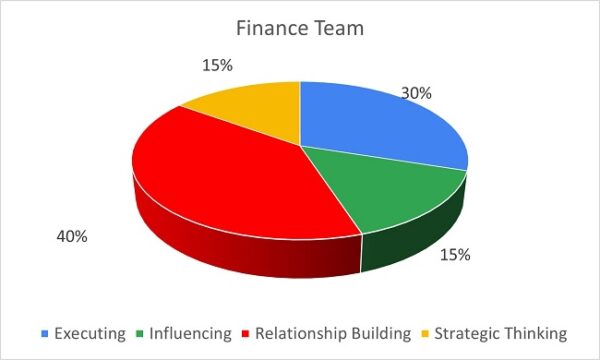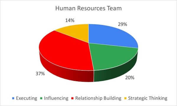 The HR team profile is significantly focussed on people (not unsurprising) and getting the job done. It would be beneficial to consider how the team is maximising the strengths of those who share analytical, strategic, input, and futuristic strengths to ensure the credibility of the team is maintained in terms of the strategic thinking for employees’ wellbeing, growth, and development. In essence, the team may work effectively together and make progress, but are they doing the right things?