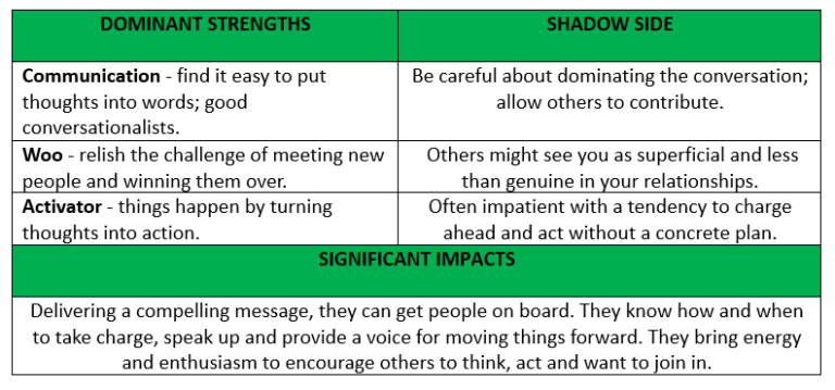 Within this signature theme, the team may rely on those with these strengths to carry the mantle for promoting the team internally and externally, building and maintaining networks, and sharing successes. Their greatest contribution is to help their team reach a much broader audience.