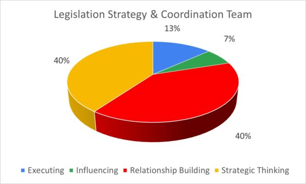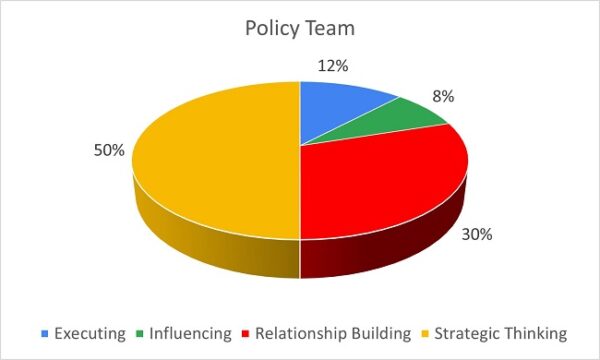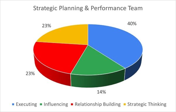These signature strengths have significant responsibility and accountability for analysis, planning and strategic direction. Therefore, it is unsurprising that a policy team is heavily weighted to the Strategic Thinking domain. Like the Relationship Building domain, there is an even spread of Strategic Thinking signature themes. Because the team asks a lot of questions, others may see this team as always doubting or questioning the validity of others’ work, which can be demoralising. These strong Strategic Thinking themes increase the seriousness and intensity of a team, which could result in lots of planning with not so much action (consider the 12% Executing Themes).