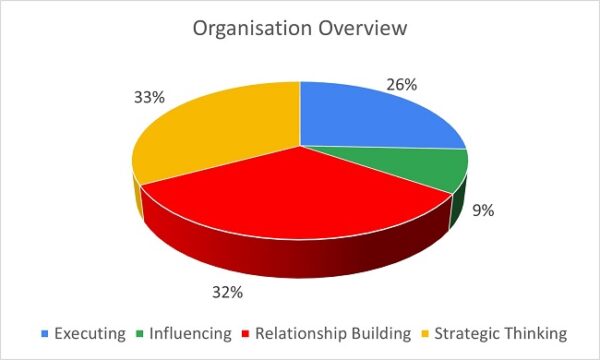 The Strategic Thinking (33%) and Relationship Building (32%) Strengths are the most dominant, accounting for two thirds of the workforce. Executing (26%) and Influencing (9%) account for 35% of the strengths profile.