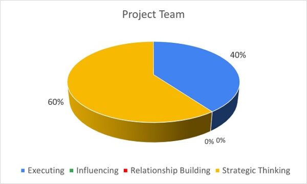 The team is evenly split within three domains – Executing, Relationship Building and Strategic Thinking and less dominance in Influencing (7%). The team might consider creating an agile mindset from the Relationship Building domain to engage and influence change.