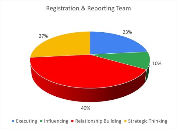 This team’s profiles are a reminder that strategic thinkers analyse, learn, make good decisions and create a clear path toward a better future. Coupled with the Relationship Building strengths, the team can be influential in maintaining standards and working with a regulatory framework.