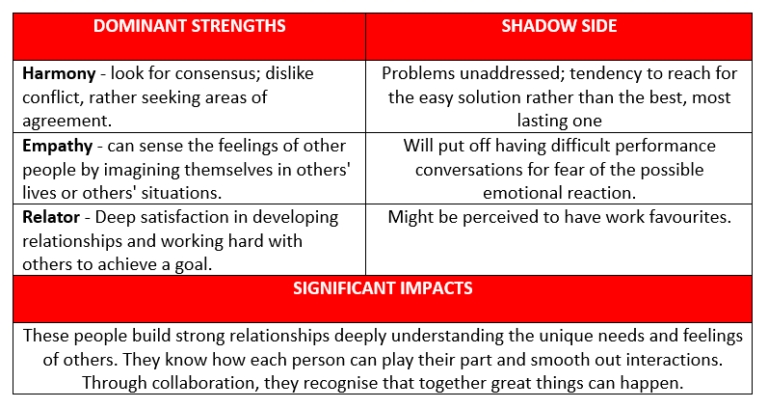 These strengths are witnessed in those who are naturally intuitive of others needs and show this through caring and compassion. The likelihood is a team that is good at bringing others together and helping them see that what they have in common is more powerful than their differences. With a natural ability to sense areas of potential conflict, the team will seek solutions to conflict before things escalate.