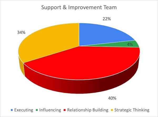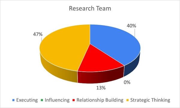 Awareness of the areas that are not the team’s greatest strength, namely Executing and Influencing, will enable team members to seek support to partner in generative ways.