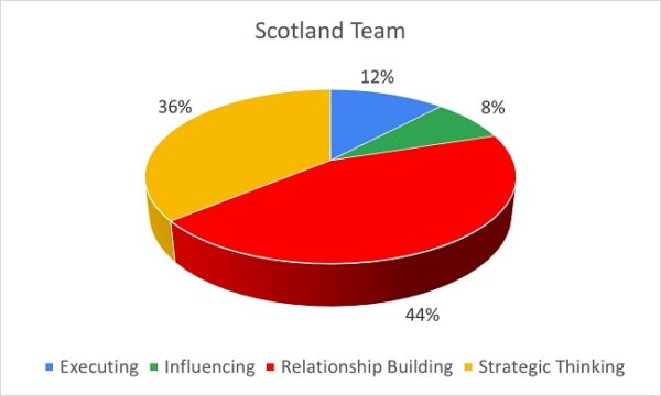 This accounts for 30% of the profile, which indicates the team recognises the importance of finding and securing valuable relationships across the organisation, but is also intentionally minded about ensuring health and wellbeing impacts on performance. Those with these strengths will build strong relationships deeply understanding the unique needs and feelings of others.